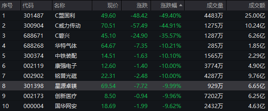 昨天暴涨的三只新股今日全线走低,位列今日A股跌幅榜前三;C盟固利跌49.4%,C威力传动跌44.91%、C碧兴跌35.57%。