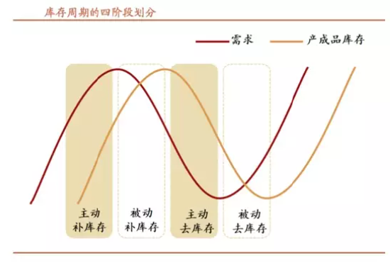 这里简单说下,库存周期也被称作基钦周期,四个阶段大致对应着美林时钟的四个阶段,主动补库存近似于过热,被动补库存近似于滞胀,主动去库存近似于衰退,被动去库存近似于复苏,在主动补库存和被动去库存阶段,对应经济繁荣和上行。