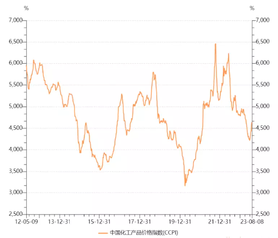 化工产品的价格底部初现。截至8月9日,中国化工产品价格指数(CCPI)约为4593点,相较于7月初上涨8.22%。化工产品价格企稳回升,有助于产业链后续进入补库周期。