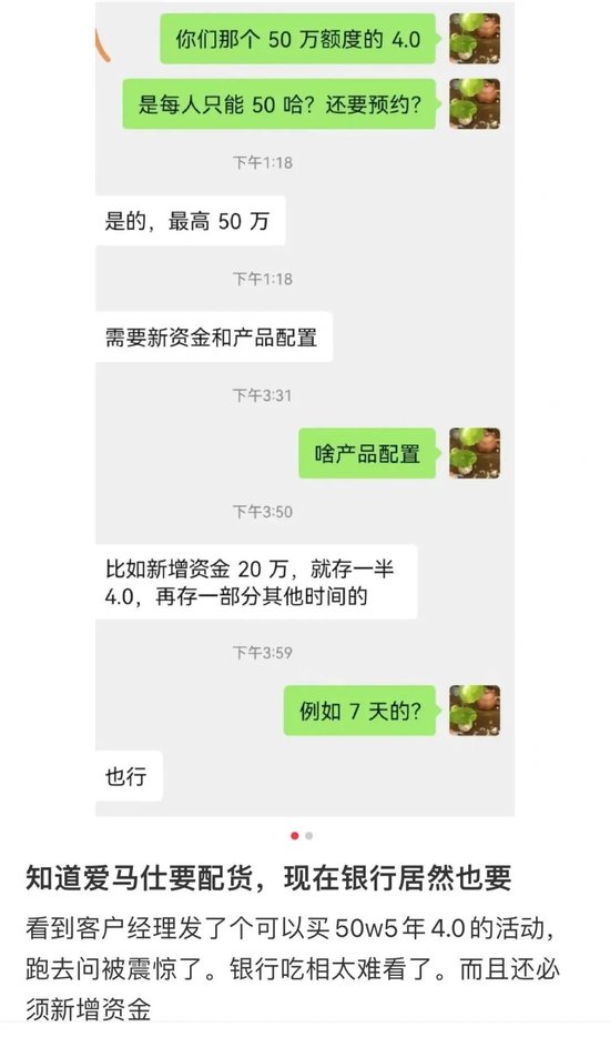 “说是额度有限,需要搭配其他产品才有购买名额。”近期,有网友在社交平台上发帖称,其从一位客户经理处获悉,购买大额存单不仅需要从其他银行转入新资金,还要按比例配置其他产品。评论区有网友表示:“我们行就是1:1才给大额存单额度,不卖理财不给额度”“我们行是1:1配定期,但没让卖理财”。