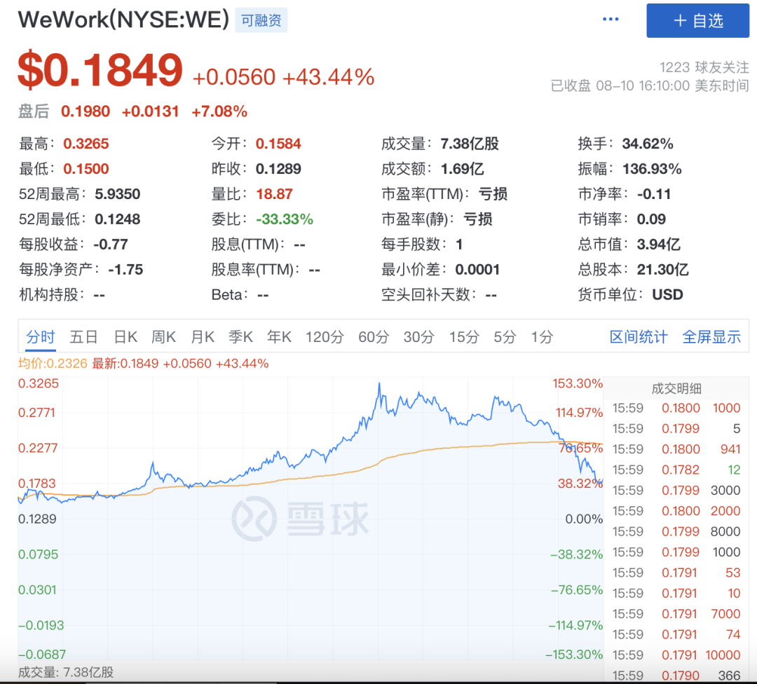 个股方面,上一交易日大跌近40%的共享办公室公司WeWork盘中上演大蹦极行情,盘中涨幅一度达到150%,随后涨幅回落,收盘上涨超43%。