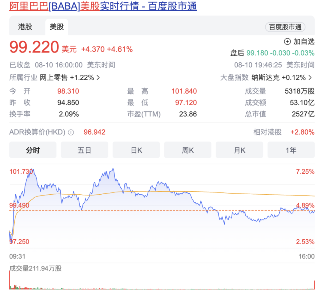 阿里巴巴美股盘中一度大涨超7%,随后涨幅有所收窄,截至收盘,涨4.61%。