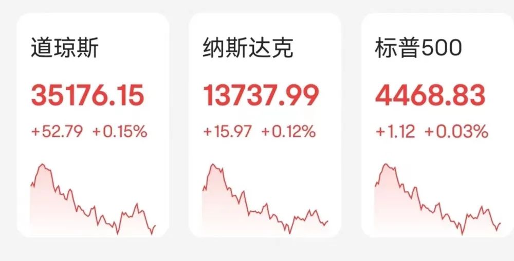 截至收盘,道琼斯指数涨0.15%,报35176.15点;标普500指数涨0.03%,报4468.83点;纳斯达克综合指数涨0.12%,报13737.99点。