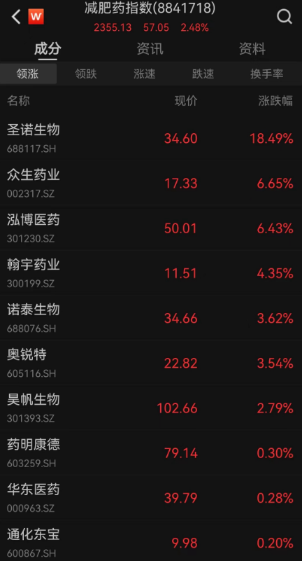 今日早间开盘,CRO板块开盘走高,减肥药概念领涨,概念指数上涨2.48%。其中圣诺生物开盘半小时内涨停,收盘小幅回落,报涨18.49%;众生药业、泓博医药、翰宇药业涨幅居前,分别上涨6.65%、6.43%、4.35%。