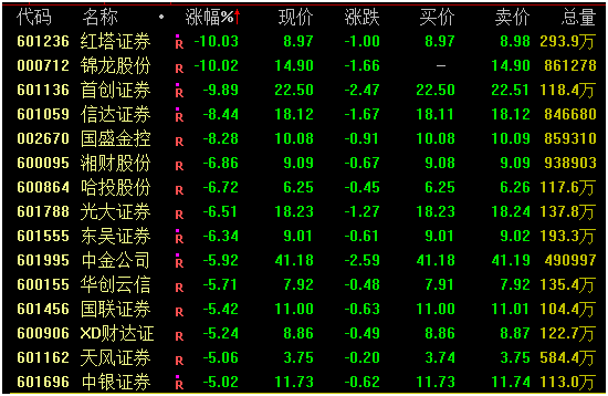 券商板块今日大幅下挫,截至收盘,锦龙股份、红塔证券跌停,首创证券逼近跌停,信达证券、国盛金控跌超8%,中金公司跌近6%,中信证券跌逾4%。