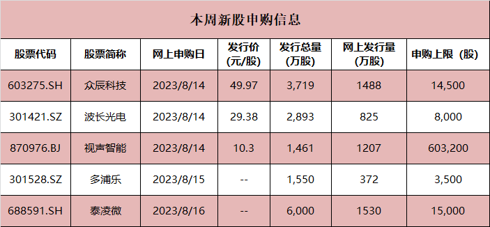 本周(8月14日—8月18日),共有5只新股将进行申购,其中创业板2只(波长光电、多浦乐),科创板1只(泰凌微),沪市主板1只(众辰科技),北交所1只(视声智能)。