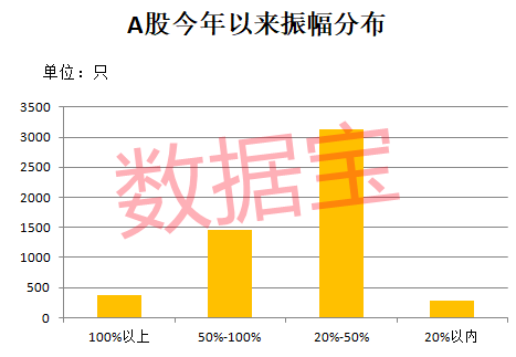证券时报·数据宝统计,年内振幅介于20%至50%之间的股票数量最多,达到3127只,占比59.56%;年内振幅介于50%至100%之间的股票数量1467只,占比27.94%,排在第二位。年内振幅100%以上的股票369只,占比7.03%。而振幅在20%以内的股票数量最少,占比仅5.47%。