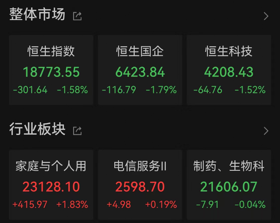 8月14日港股三大指数齐跌。据Wind数据,恒生指数收于18773.55点,跌1.58%。恒生国企指数收于6423.84点,跌1.79%,恒生科技指数收于4208.43点,跌1.52%。大市成交1041.47亿港元。