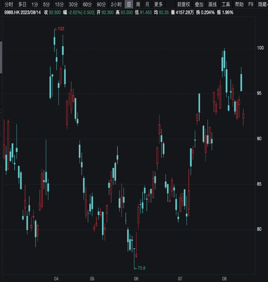 8月14日,科技股随大市向下,阿里巴巴-SW跌2.62%报92.8元,腾讯控股跌0.77%报333.2港元,美团-W、小米-W、京东集团-SW、网易-S及哔哩哔哩-W跌0.46%至1.3%,百度-SW及快手-W分别跌2.32%及1.9%。