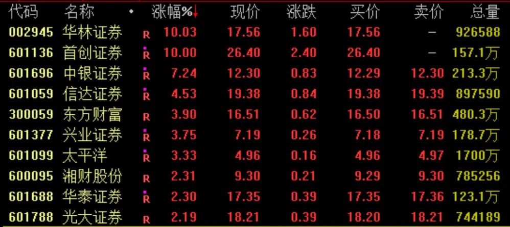 金融板块午后集体拉升,券商板块再度活跃,截至收盘,华林证券、首创证券涨停,中银证券涨超7%,信达证券涨超4%,东方财富涨近4%。