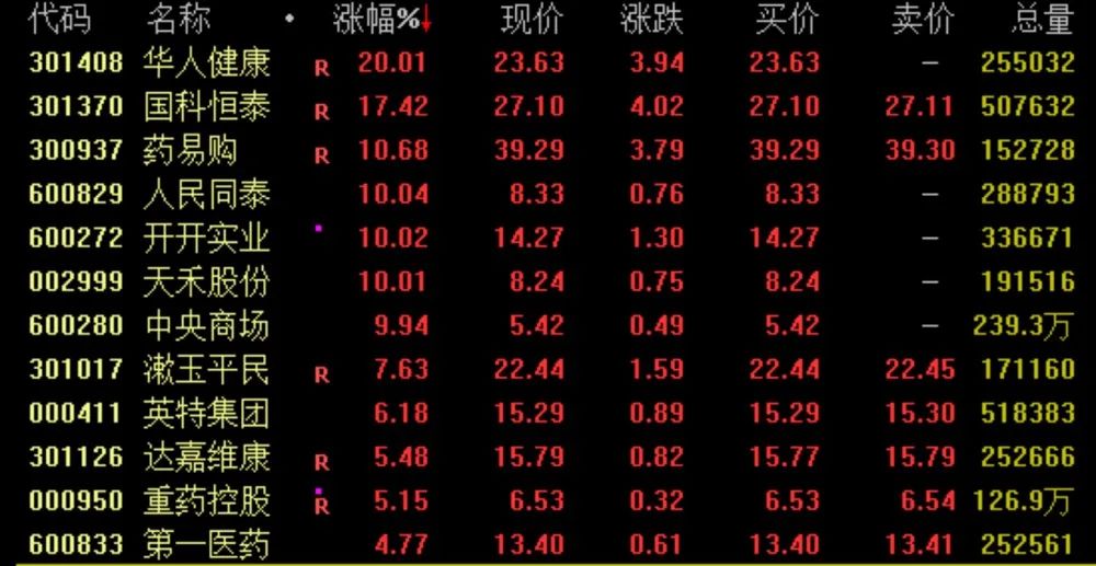 药店零售概念今日强势拉升,截至收盘,华人健康“20cm”涨停,国科恒泰涨超17%,药易购涨近11%,人民同泰、开开实业亦涨停。