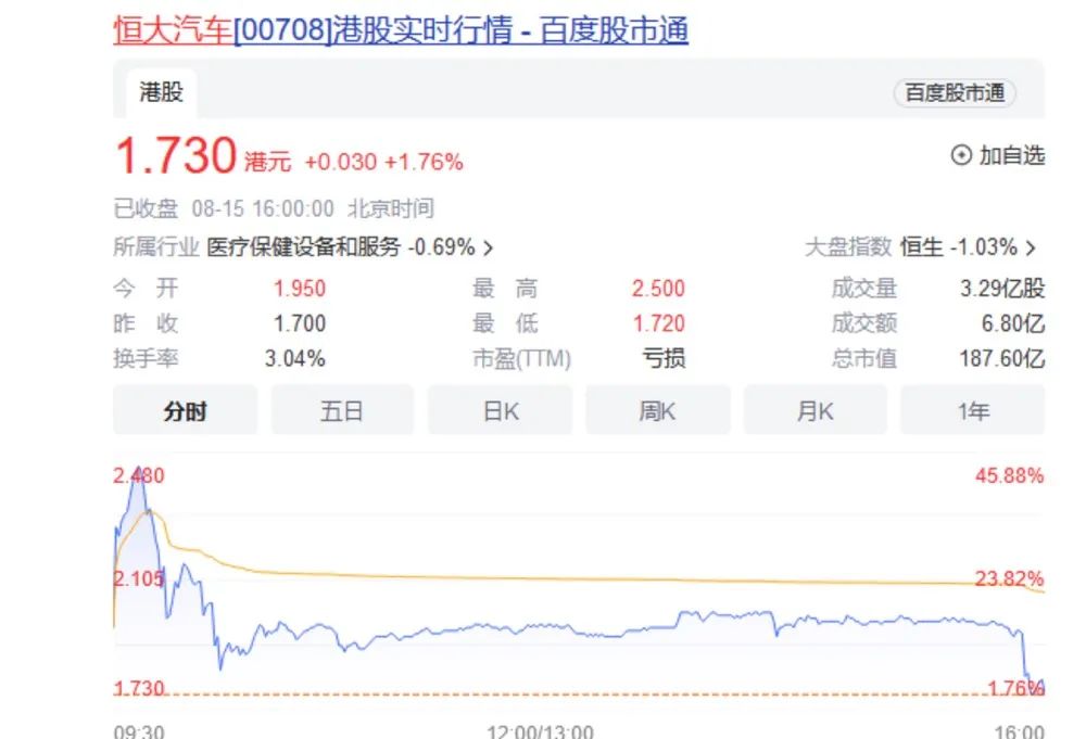 恒大汽车(00708,HK)开盘后快速走高,一度大涨47%,尾盘跳水一度接近翻绿。收盘仅上涨1.76%报1.73港元。昨日,该股尾盘拉升,收盘上涨约14%。