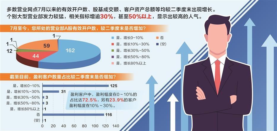 数据显示,多数营业网点在此期间有效开户数、股基成交额、客户资产总额、两融余额、基金代销金额等均较二季度末出现增长,增幅普遍不超过10%。个别大型营业部发力较猛,相关指标增逾30%,甚至50%以上,显示出较高的人气。