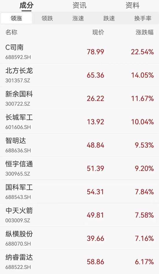 军工板块今日早盘迎来久违的大涨,航天航空、船舶制造等多个板块表现强势,板块内个股普遍飘红,新余国科等多只个股涨超10%。