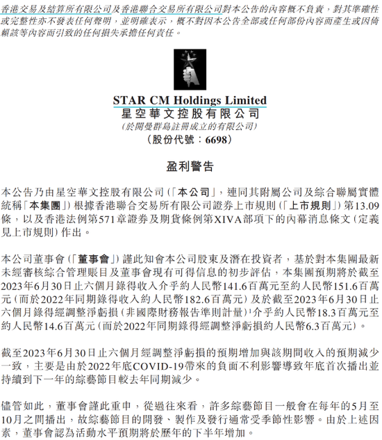 星空华文上半年经营状况差强人意。公司于8月2日发布盈利警告公告表示:“本集团预期将于截至2023年6月30日止六个月录得收入介乎约人民币141.6百万元至约人民币151.6百万元(而于2022年同期录得收入约人民币182.6百万元)及于截至2023年6月30日止六个月录得经调整净亏损(非国际财务报告准则计量)1介乎约人民币18.3百万元至约人民币14.6百万元(而于2022年同期录得经调整净亏损约人民币6.3百万元)。”