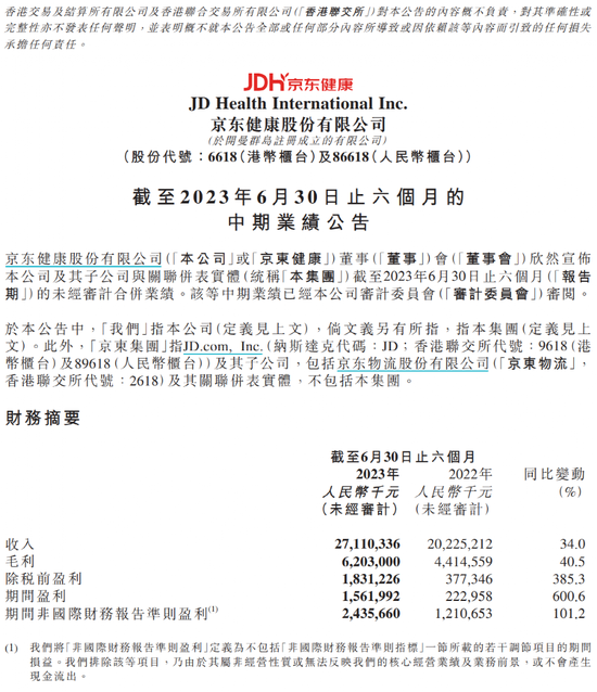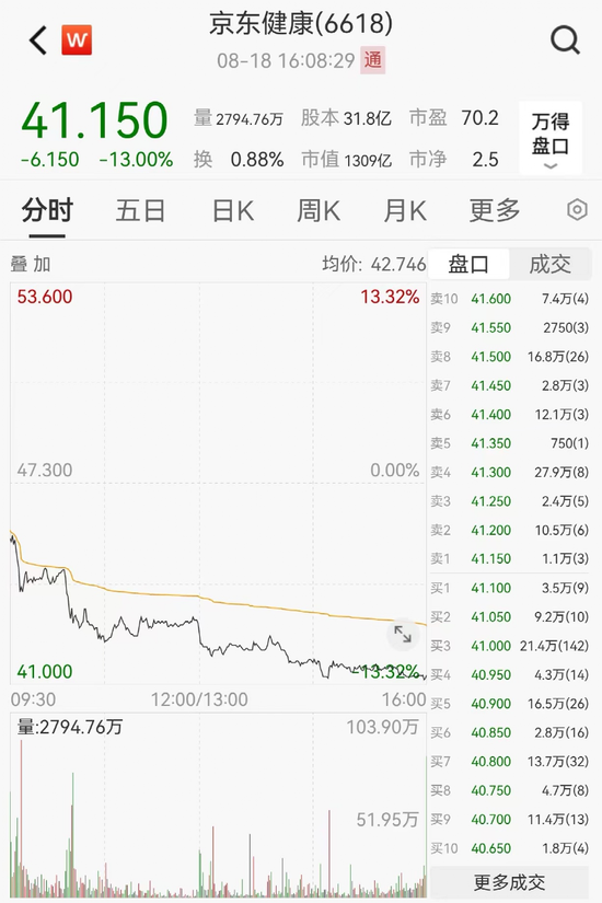 尽管此前公布半年报显示公司的净利润同比增长101.1%,且多家机构发表研报表示看好,8月18日,京东健康股价却低开低走,最高跌幅达13.32%,全日收于41.15港元,跌13%。