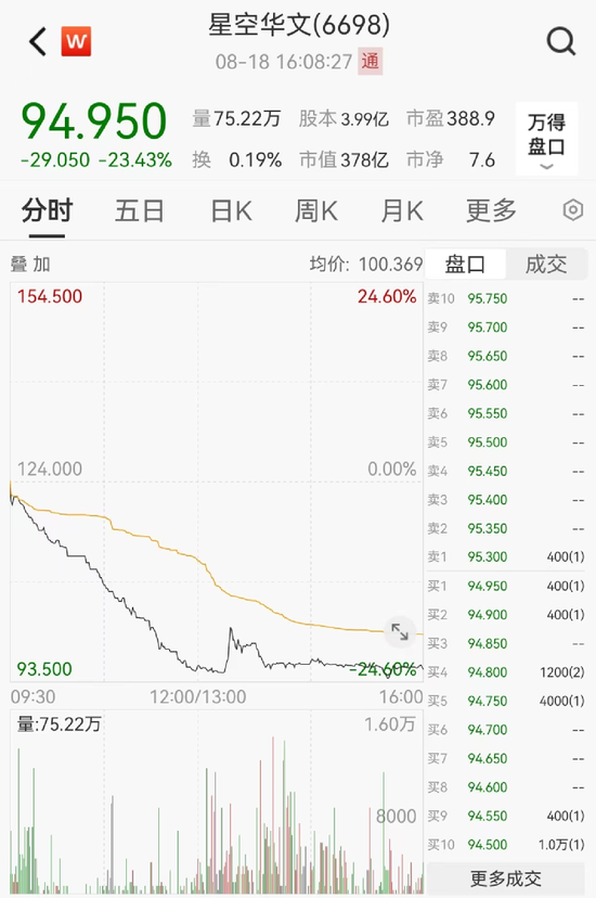 8月18日,《中国好声音》母公司星空华文股价大跌,最大跌幅达24.60%,最终收于94.95港元,跌23.43%,市值缩水115.91港元。