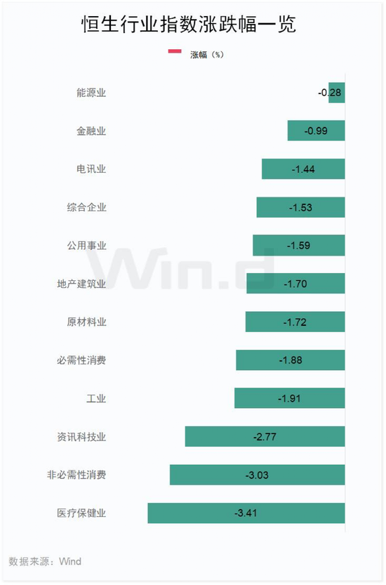 从行业表现看,恒生行业指数日内全线下跌,医疗保健业跌3.41%,非必需性消费跌3.03%,资讯科技业跌2.77%。