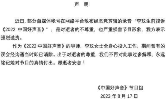 《中国好声音》随即在官方微博回应称,“近日,部分自媒体账号在网络平台散布经恶意剪辑的录音‘李玟生前控诉《2022中国好声音》’,是对逝者的不尊重,也严重损害节目形象,我方表示强烈谴责。”并表示之后“出于对逝者的尊重,我们不再对此事过多解释”。
