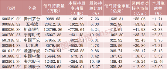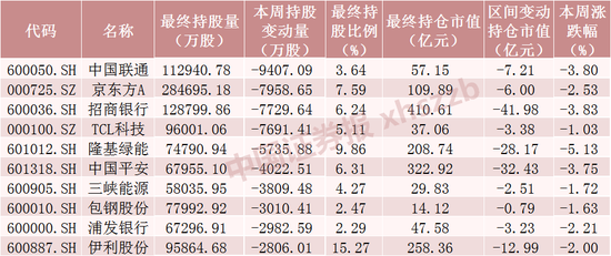 本周持仓市值减少额居前十的股票均被北向资金减仓,其中五粮液、招商银行、中国平安、隆基绿能、伊利股份被减仓超1900万股。