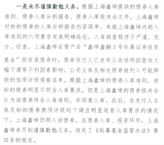 在投资环节,鑫绰投资旗下产品投资某债券时,债券发行人已发布公告说明因营收大幅下滑等不利因素影响,公司主体及相关债券被列入可能降级的信用评级观察名单,鑫绰投资的债券投决会却同意入库。此后,在发行人主体及标的债券债项评级均下调且明显违背入库要求的情况下,鑫绰投资仍购入该债券。