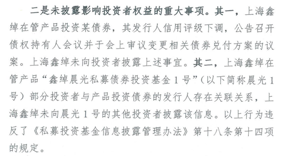 在信息披露环节,鑫绰投资在管产品投资某债券后,债券发行人信用评级下调,公告召开了债权持有人会议并于会上审议变更相关债券兑付方案的议案。鑫绰投资未向投资者披露此事宜。