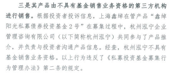 比如,经中基协调查,在募集环节,鑫绰投资旗下某在管产品募集过程中,杭州泓宁企业管理咨询有限公司(下称杭州泓宁)共同参与了产品推介,并负责与投资者沟通产品信息。经查,杭州泓宁不具有基金销售业务资格。