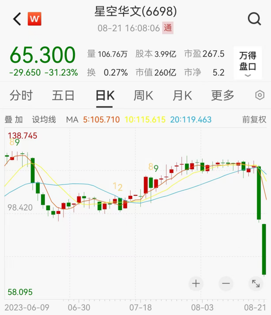 8月21日,《中国好声音》母公司星空华文继上周五大跌23.43%后,股价继续大幅下挫,最高跌幅达32.02%,收于65.30港元,跌31.23%。报81.6港元。两个交易日内,星空华文总市值蒸发超220亿港元,股价腰斩。