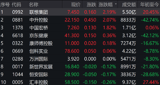 联想集团涨2.19%,中升控股涨2.07%领涨蓝筹。