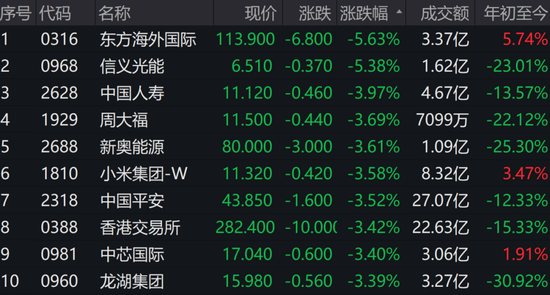 东方海外国际跌5.63%,信义光能跌5.38%,领跌蓝筹。