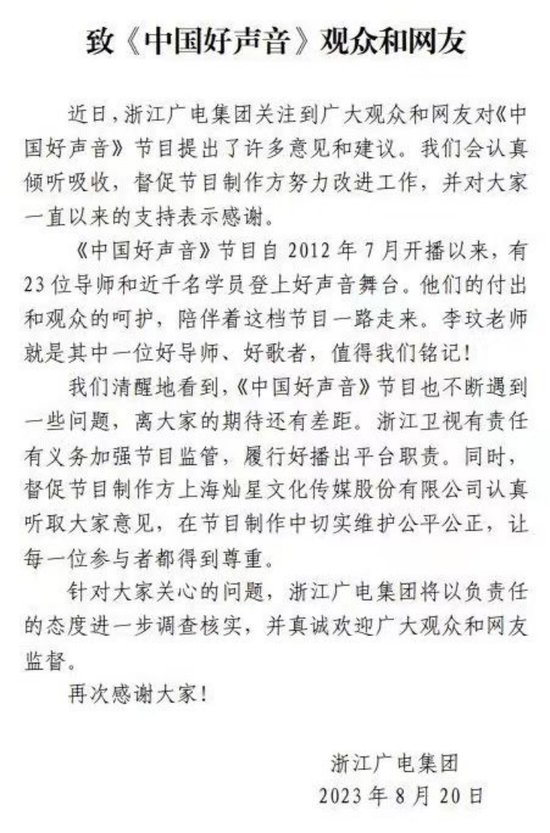 天后李玟生前在节目《中国好声音》担任导师时“遭遇不公对待,甚至遭到节目组羞辱”一事继续发酵。随着多名学员也站出来揭露节目内幕,8月20日晚,浙江广播电视集团在其官方网站上发布了一份《致<中国好声音>观众和网友》的通知,表示将对由此引发的争议进行调查和核实。