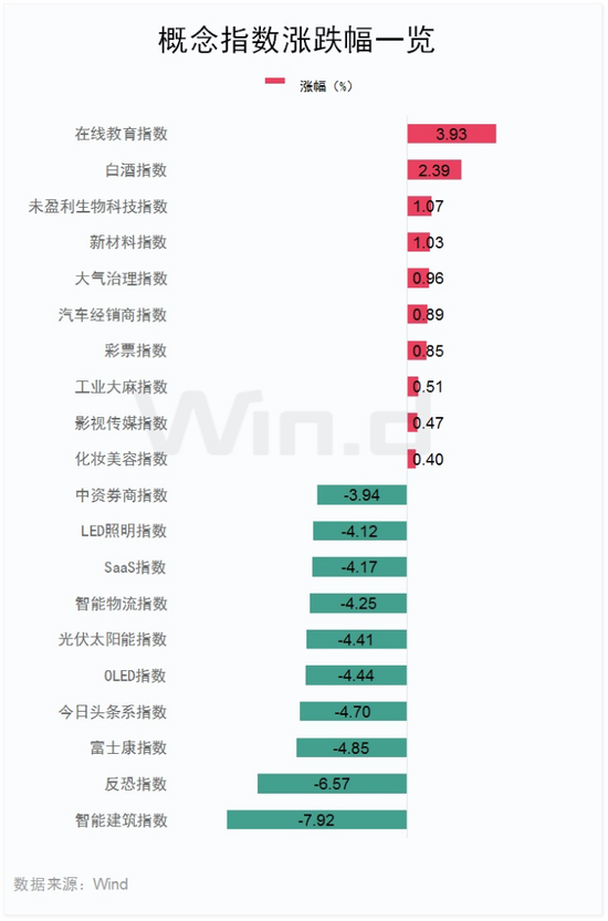 从盘面来看,Wind概念板块多数下跌,智能建筑指数跌7.92%,反恐指数跌6.57%,富士康指数跌4.85%。涨幅方面,在线教育指数涨3.93%,白酒指数涨2.39%,未盈利生物科技指数涨1.07%。