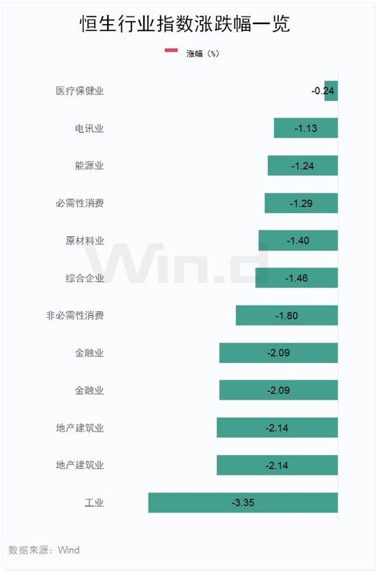 从行业表现看,恒生行业指数日内全线下跌,工业跌3.35%,地产建筑业跌2.14%,地产建筑业跌2.14%。
