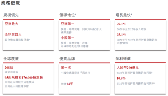 顺丰控股申请材料显示,公司是一家全球领先的综合物流服务提供商,根据弗若斯特沙利文报告,按2022年收入计,是中国及亚洲最大的综合物流服务提供商,也是全球第四大综合物流服务提供商。