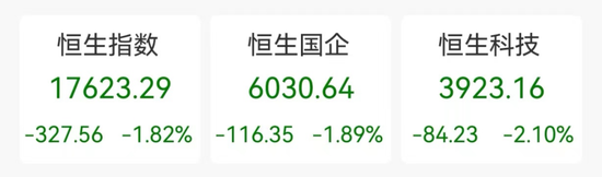 8月21日,香港恒生指数跌1.82%,报17623.29点;恒生科技指数跌2.10%,报3923.16点;恒生国企指数跌1.89%,报6030.64点;恒生红筹指数跌2.13%,报3465.52点,大市成交1085.43亿港元。南向资金净买入额为95.65亿港元。