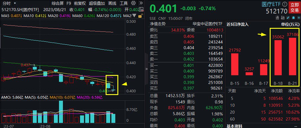 板块方面,调整已久的医药医疗板块近期再度震荡走低,引发市场关注。8月21日A股三大指数集体跌逾1%,尽管医药医疗板块跌幅小于主要指数,但连日调整背景下,中证医疗指数还是继续刷新逾三年新低。跟踪指数的医疗ETF(512170)场内价格跌0.74%,收盘价0.401元。