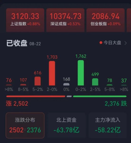 周二(8月22日),A股三大股指震荡上行,全线飘红。截至收盘,上证指数涨0.88%报3120.33点,深证成指涨0.53%报10374.73点,创业板指微涨0.09%报2086.94点;两市量能有所放大,合计成交金额达8183.8亿元,北向资金净卖出63.78亿元。总体上看,两市个股涨多跌少,上涨个股2502只,略多于下跌个股。其中,涨停个股达45只,跌停个股达14只。