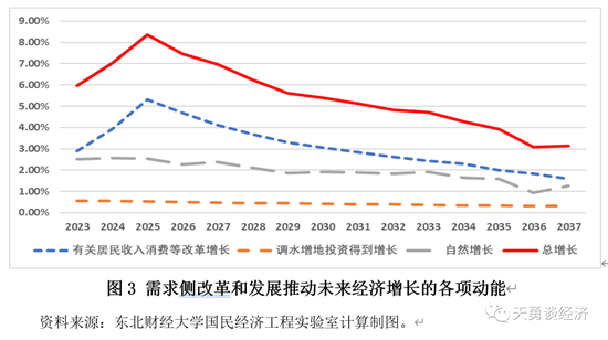 2023~2037年,需求侧进行人口迁移放开、允许农村土地交易、放开农村住宅同房同价同权市场、居住供给多元供给和提高财政民生支出比重等改革,年平均居民消费支出将增加48210亿元,居民投资年均增量为11523亿元,共同在需求侧形成年均3.11%的经济增长拉动速度。