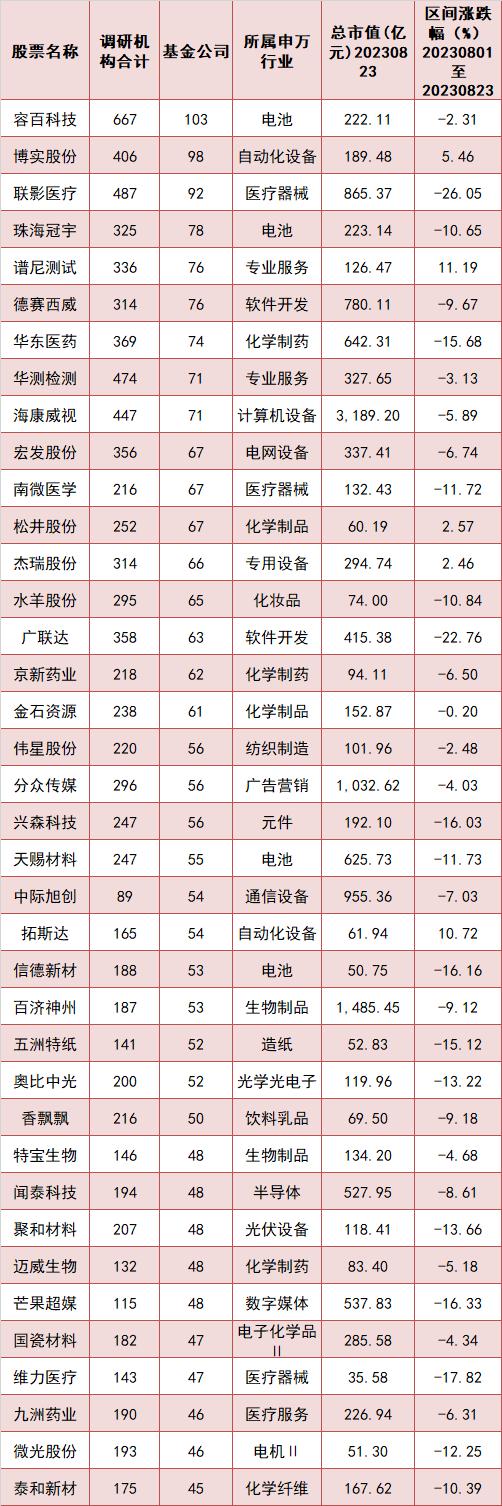 此外,联影医疗在近一个月被超过90家基金公司调研,珠海冠宇、谱尼测试、德赛西威、华东医药等多家A股上市公司被超过70家基金公司调研。