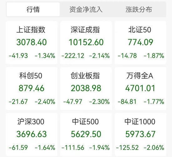 具体来看,A股方面,两市股指延续弱势,盘中单边下行,尾盘加速跳水。截至收盘,沪指跌1.34%报3078.4点,深成指跌2.14%报10152.6点,创业板指跌2.3%报2038.98点,科创50指数跌2.4%;两市合计成交7059亿元,较昨日减少约1000亿元;北向资金今日再度大举出逃,全日净卖出104.6亿元,8月以来已累计减仓近750亿元。