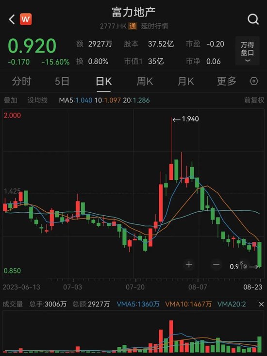 Wind数据显示,截至收盘,富力地产股价报0.92港元/股,跌幅15.6%。上一个交易日收盘价为1.09港元/股。