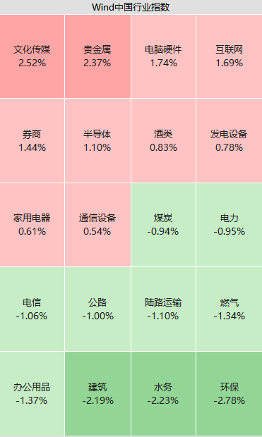盘面上,上午传媒股走高,AI算力、数字资产领涨;贵金属、券商股收获一波行情;环保、水务概念陷入深度回调,能源板块不振。