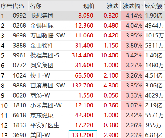 港股市场上,早间三大指数集体高开:恒指涨0.82%,恒生国企涨0.75%,恒生科技涨1.2%。上午港股走势喜人,恒生科技涨幅一度突破2%,联想集团领涨。