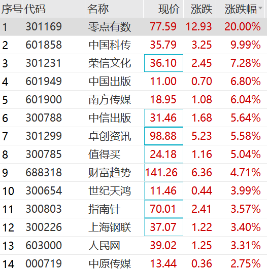 同时,上午传媒板块恢复景气值,数字资产、中文语料库、抖音平台等概念走高。零点有数拉出20CM涨停,中国科传涨停,荣信文化中国出版南方传媒等持续拉升。
