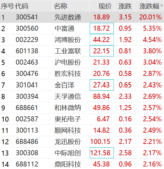 8月24日上午,先进数通开盘后股价迅速走高,实现20CM涨停。除先进数通外,中富通鸿博股份工业富联沪电股份等早间均有明显涨幅。