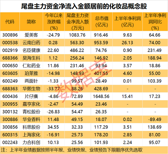 从尾盘主力资金流向来看,超六成概念股尾盘获得主力加仓,其中爱美客、云南白药、名臣健康、昊海生科的主力净流入额居前。