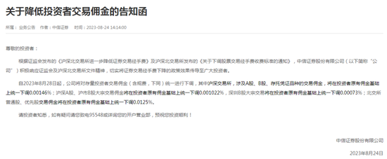 午后,中信证券发布了《关于降低投资者交易佣金的告知函》。自2023年8月28日起,公司将对存量投资者交易佣金(含规费,下同)统一进行下调,其中沪深交易所,涉及A股、B股、存托凭证品种的交易佣金,将在投资者原有佣金基础上统一下调0.00146%;沪深A股、沪市B股大宗交易佣金将在投资者原有佣金基础上统一下调0.001022%,深圳B股大宗交易将在投资者原有佣金基础上统一下调0.00073%;北交所普通股、优先股交易佣金将在投资者原有佣金基础上统一下调0.0125%。