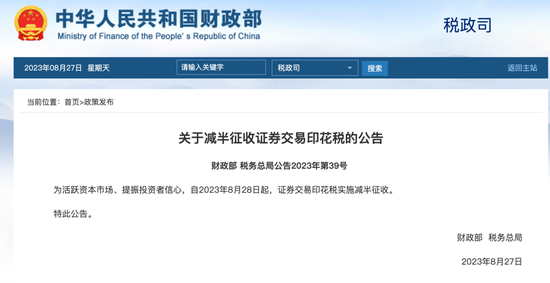 8月27日,财政部、税务总局公告,为活跃资本市场、提振投资者信心,自2023年8月28日起,证券交易印花税实施减半征收。