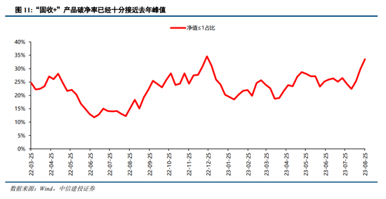 为了跟踪当前市场的负反馈情况,我们跟踪分析“固收+”产品的净值情况发现,当前产品破净比例已经到达相对高位,这从另一个角度说明当前市场情绪已经位于低谷。截至8月25日,单位净值小于等于1的“固收+”产品占比已达33.55%,已经十分接近去年12月23日34.60%的破净率峰值。