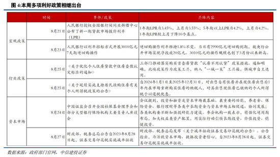 2)在行业政策方面,8月25日,住建部、中国人民银行、金融监管总局联合印发了《关于优化个人住房贷款中住房套数认定标准的通知》,推动落实购买首套房贷款“认房不用认贷”政策措施。7月底以来,房地产政策积极信号不断释放。7月24日,中央政治局会议首次提出要“适时调整优化房地产政策,因城施策用好政策工具箱”。7月27日,住建部就落实会议精神,强调要“大力支持刚性和改善性住房需求”,进一步明确了三大政策支持方向,包括降低购买首套房首付比例和贷款利率、改善性住房换购税费减免、个人住房贷款“认房不用认贷”。此次三部门发布优化住房认定标准的通知,是对此前中央调整优化房地产政策定调的具体落实,有助于释放刚性需求、改善性需求。
